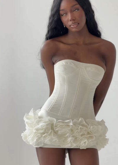 Turn heads this season in our show-stopping white corset and ruffle mini skirt set. Featuring a structured strapless corset top with a figure-enhancing fit and a voluminous layered ruffle skirt for that ultra-glam finish, this set is perfect for making a bold statement.